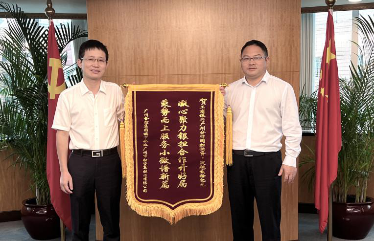 会后,王达总经理助理代表广州金控集团和广州再担保向工商银行广州分行赠送锦旗——“凝心聚力银担合作开好局,乘势而上服务小微谱新篇”,祝愿双方合作更上新台阶。