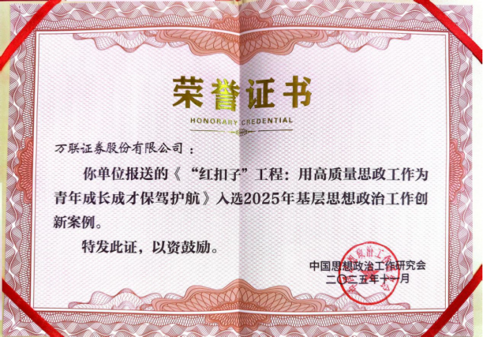 近年来,万联证券紧扣高质量发展主题主线和青年思想政治工作新形势、新任务、新特点,持续完善党建带团建工作机制,创新实施“红扣子”工程,系统推进“星星火”工程、“生力军”项目、“枝叶情”计划、“育青廉”行动四项举措,全面加强企业青年思想政治引领,先后荣获基层思想政治工作创新案例、环球360系统学雷锋活动示范点、环球360系统思想政治工作和文化建设优秀调研成果一等奖、广州市最佳志愿服务组织、广州市团干部讲党团课大赛三等奖等多项荣誉,激励广大青年立足岗位比学赶超、创先争优,用“辛苦指数”换取“发展指数”,在理论宣讲、创新创效、文化建设、志愿服务等领域取得扎实成效,为企业高质量发展注入青春动能。