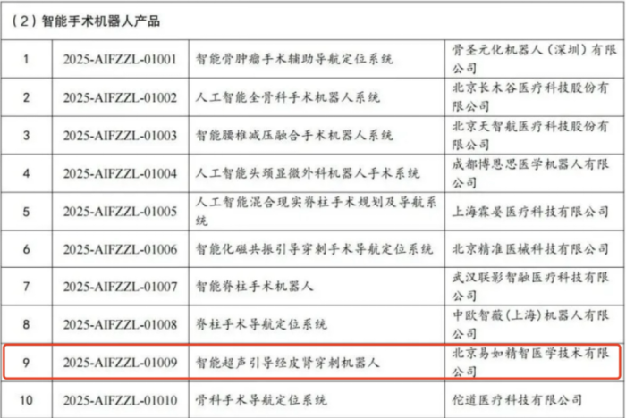 天使母基金合作机构已投项目易如精智,其智能手术机器人产品成功入围由工信部科技司、国家药监局医疗器械注册管理司发布的“2025年人工智能医疗器械创新任务揭榜挂帅名单”。易如精智是一家创新泌尿外科医疗机器人企业,由北京大学医学部知名临床专家、北京航空航天大学生物医学工程学院及手术机器人研究所权威工程专家联合创立,致力于开发泌尿外科肾结石手术机器人、良性前列腺增生激光手术机器人等一系列全球领先的泌尿外科智能手术机器人平台及相关创新手术耗材平台。