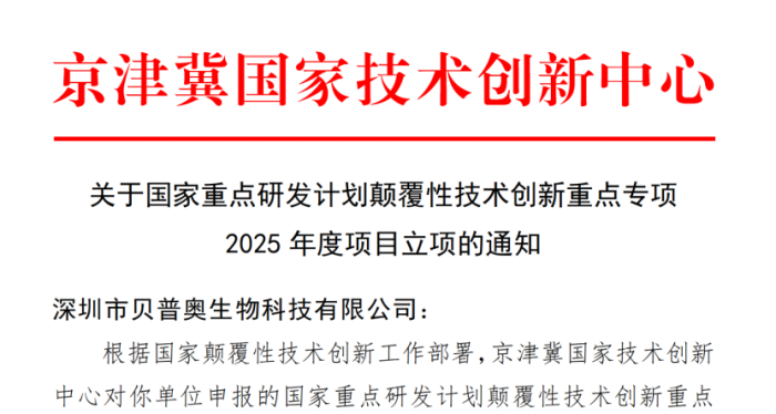 【贝普奥生物获批“国家重点研发计划颠覆性技术创新重点专项”】
