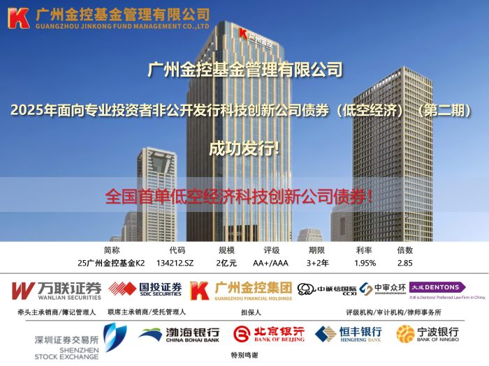 2025年4月17日,广州金控集团旗下广州金控基金管理有限公司2025年面向专业投资者非公开发行的科技创新公司债券(低空经济)(第二期)在深圳证券交易所成功发行。本期债券发行规模2亿元,期限3+2年,票面利率1.95%,全场认购倍数2.85倍,是全国首单低空经济科技创新公司债券!